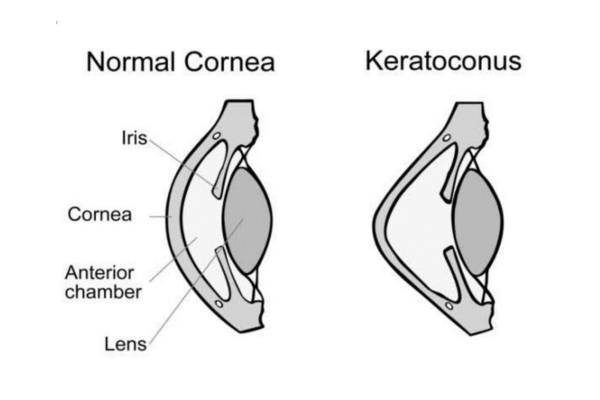 In Keratoconus the cornea thins out and bulges like a cone, changing the shape of the cornea, causing defocusing of light rays out of retina. Patient develops Myopic Astigmatism, sometimes with Myopia and it will keep on progressing.